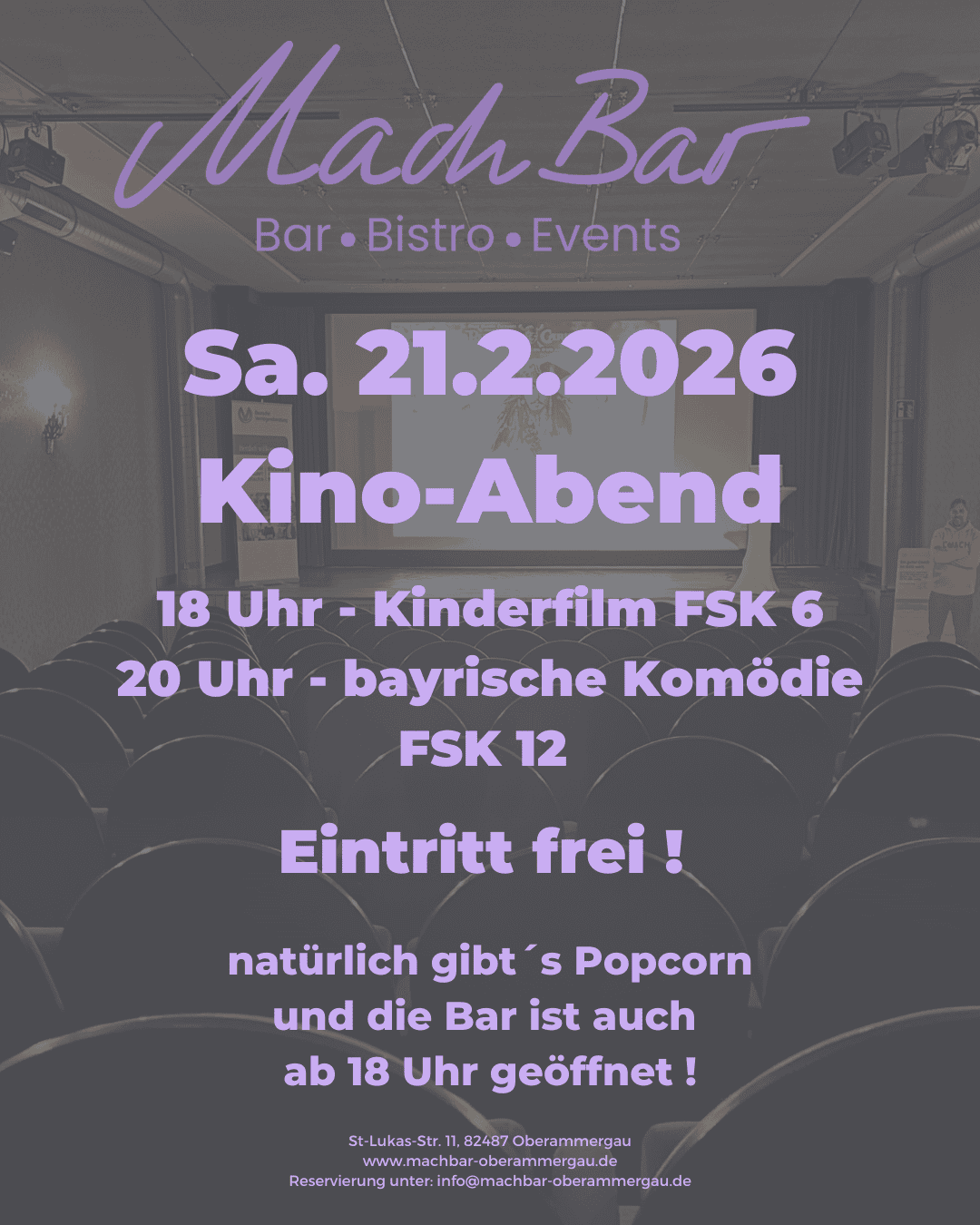 Entdecke die Vielfalt unserer Events bei MachBar in Oberammergau! In unserem multifunktionalen Kino bieten wir eine breite Palette an Veranstaltungen – von packenden Filmvorführungen bis hin zu exklusiven Eventabenden. Unsere Bar verwandelt sich regelmäßig in einen lebendigen Treffpunkt für Themenabende, Live-Musik und vieles mehr. Egal, ob du eine unvergessliche Feier planst oder einfach einen unterhaltsamen Abend mit Freunden verbringen möchtest, MachBar ist der ideale Ort dafür. Schau regelmäßig vorbei, um keine unserer spannenden Veranstaltungen zu verpassen!