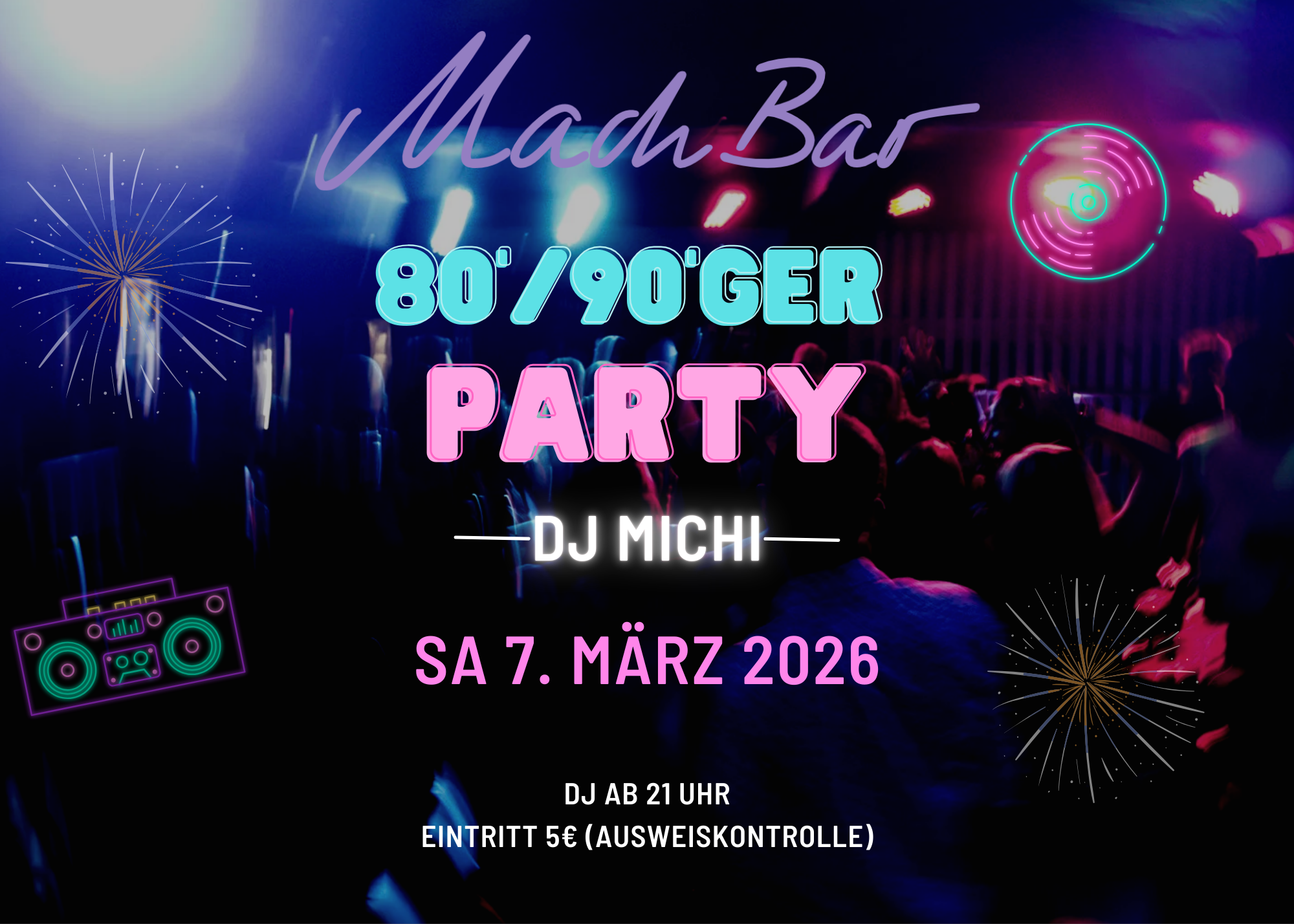 Mach dich bereit, zu den größten Hits der 80er Jahre abzutanzen! Am 26. Oktober 2024 feiern wir eine mega Party voller Neonlichter, ikonischer Musik und unvergesslicher Stimmung. Egal, ob du Fan von wilden Frisuren, knalligen Farben oder einfach nur tanzfreudig bist – diese Party katapultiert dich direkt zurück in die glorreichen 80er Jahre! Freu dich auf eine Nacht voller: Non-Stop 80er Musik von unseren Top-DJs Eine Tanzfläche voller Energie und Spaß Klassische Mitsing-Hymnen, die jeder liebt Pack deine besten 80er-Outfits ein und sei bereit für eine Zeitreise voller Spaß und Nostalgie. Wir sehen uns auf der Tanzfläche!